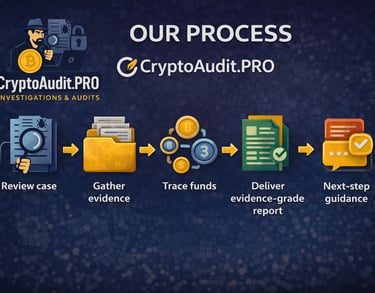 CryptoAudit.PRO provides blockchain forensic investigations, smart contract audits, and cryptocurrency tracing reports for informational and investigative purposes only. We do not offer financial services, investment advice, asset management, legal representation, or fund recovery guarantees. All services rendered are billed based on the time and complexity involved in each case and are similar in structure to professional consulting or accounting services.